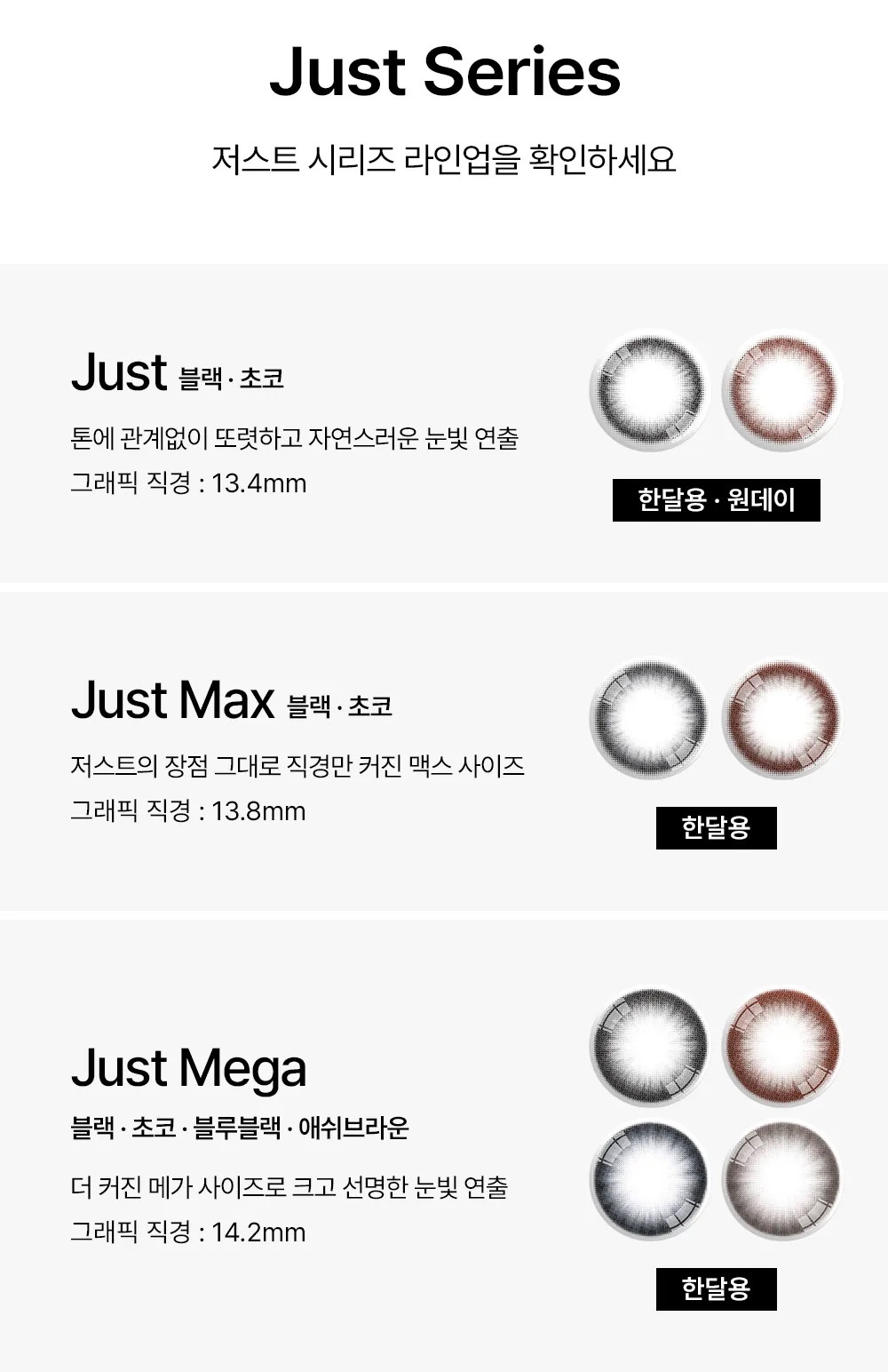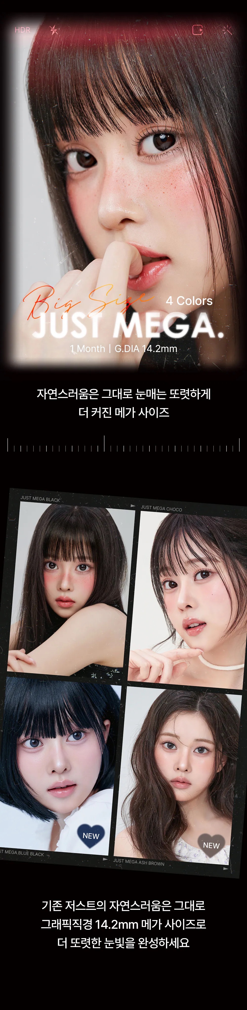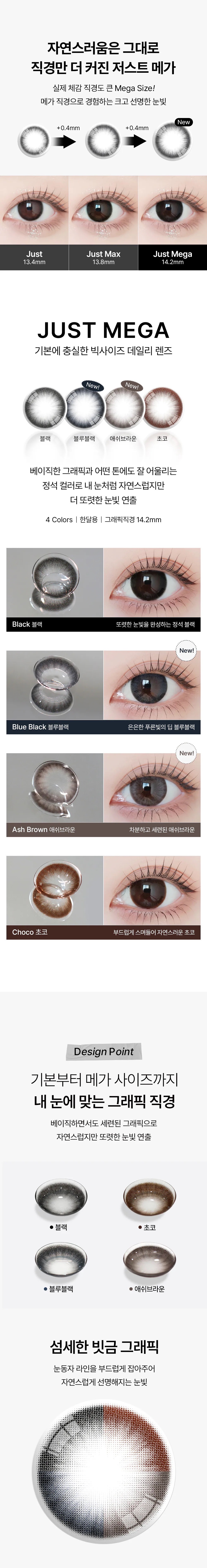 Ann365 Just Mega 挑戰韓系直徑天花板! 全新登場的 Blue Black 與 Ash Brown,在 15.0mm巨瞳規格下,以 14.2mm 超大著色直徑改寫眼神深邃度。利用極致擬真的原生色調,揉合細微放射花紋與柔焦外圈,讓雙眼無痕放大,瞬間綻放如同做了「半永久」般的靈動水光感,美得深邃且毫無破綻。