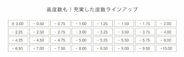 | 近視度數 | 0.00, -1.00, -1.25, -1.50, -1.75, -2.00, -2.25, -2.50, -2.75, -3.00, -3.25, -3.50, -3.75, -4.00, -4.25, -4.50, -4.75, -5.00, -5.50, -6.00, -6.50, -7.00, -7.50, -8.00, -8.50, -9.00, -9.50, -10.0 |