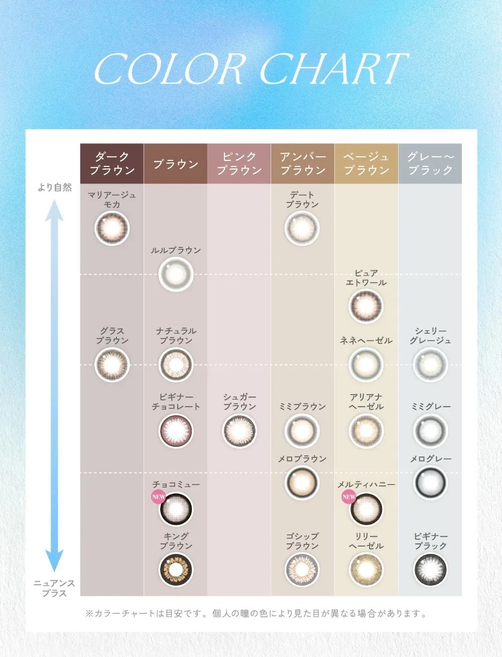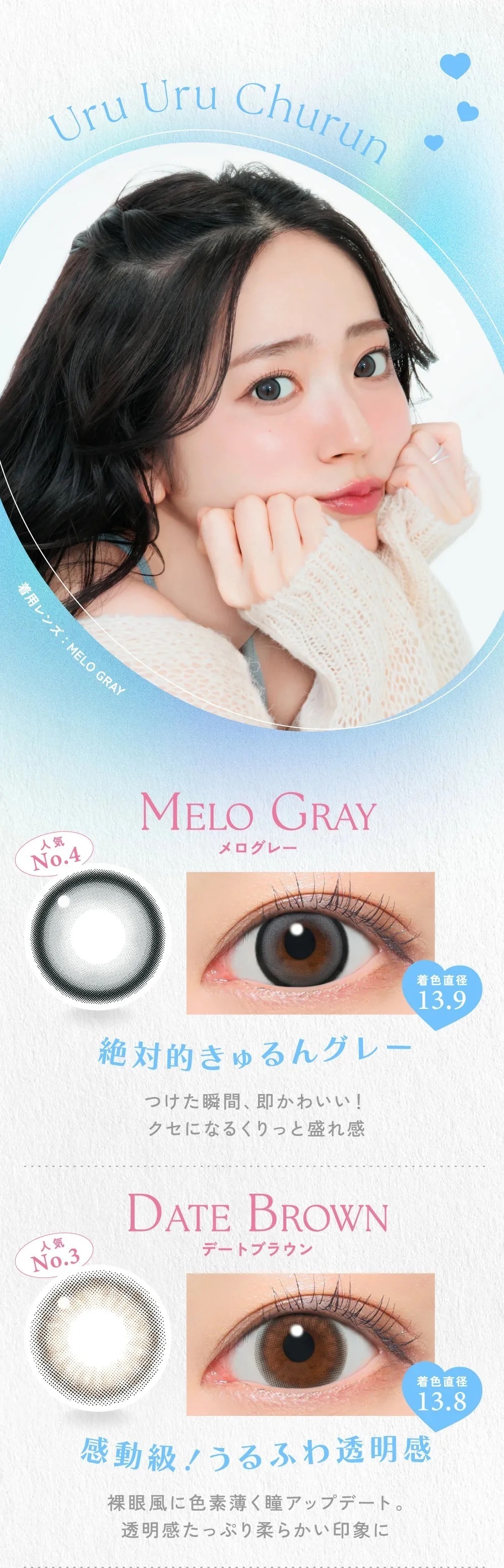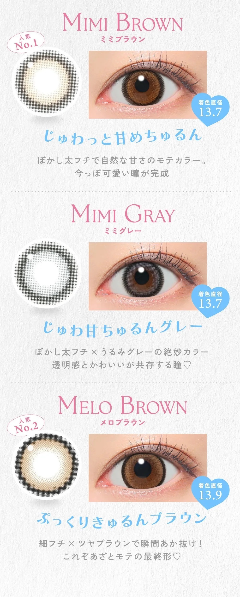 Melty Honey蜜糖棕美瞳,著色直徑13.6mm,溫柔透亮的米棕色調,自然放大雙眸,增添清新甜美感,適合日常佩戴。