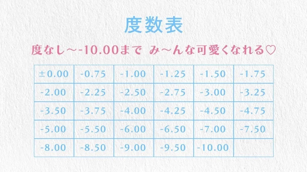| 近視度數 | 0.00, -0.75, -1.00, -1.25, -1.50, -1.75, -2.00, -2.25, -2.50, -2.75, -3.00, -3.25, -3.50, -3.75, -4.00, -4.25, -4.50, -4.75, -5.00, -5.50, 6.00, -6.50, -7.00, -7.50, -8.00, -8.50, -9.00, -9.50, -10.0 |