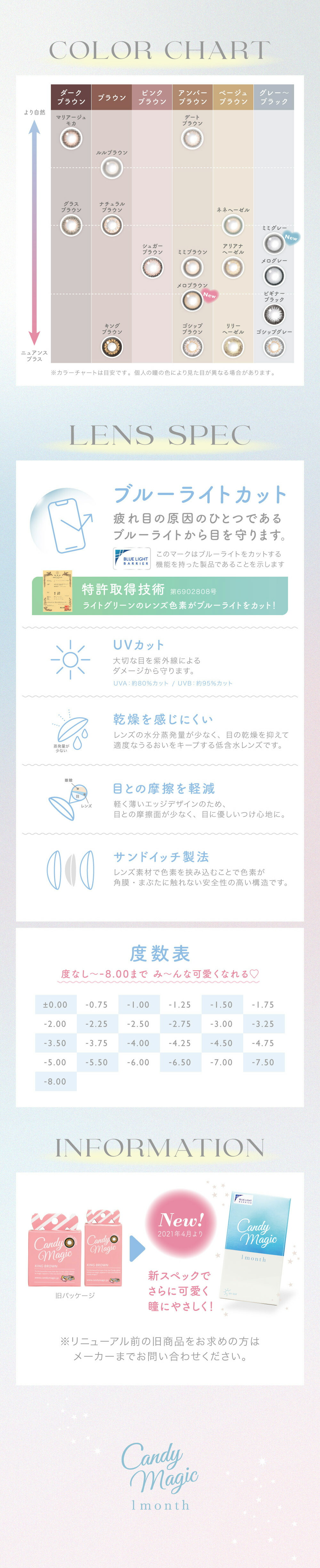 | 近視度數 | 0.00, -0.75, -1.00, -1.25, -1.50, -1.75, -2.00, -2.25, -2.50, -2.75, -3.00, -3.25, -3.50, -3.75, -4.00, -4.25, -4.50, -4.75, -5.00, -5.50, 6.00, -6.50, -7.00, -7.50, -8.00, -8.50, -9.00, -9.50, -10.0 |