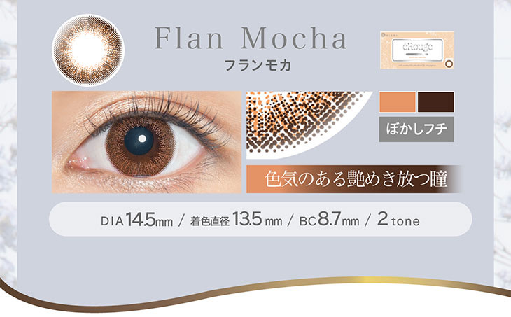 FlanMocha 纖細的橘棕色配合演繹女性柔美♪表現瞳體溫柔感覺,擁有色澤光潤的明眸。新色鏡片,Lucent Brown和FlanMocha每一天都可以輕鬆使用的自然感,14.5mm配合雙層色設計加深內部存在感和自然感,體現成熟魅力♪