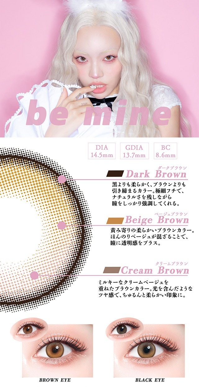 日本 Y2K 辣妹品牌 GAL NEVER DIE 月拋新色「be mine」強勢登場!深褐色鎖邊搭配米棕與奶油棕內圈,完美揉合高顯色與「晶瑩水光感」。支援高達 1000 度近視,為雙眼注入艷麗又充滿立體感的光澤,甜酷辣妹必備!