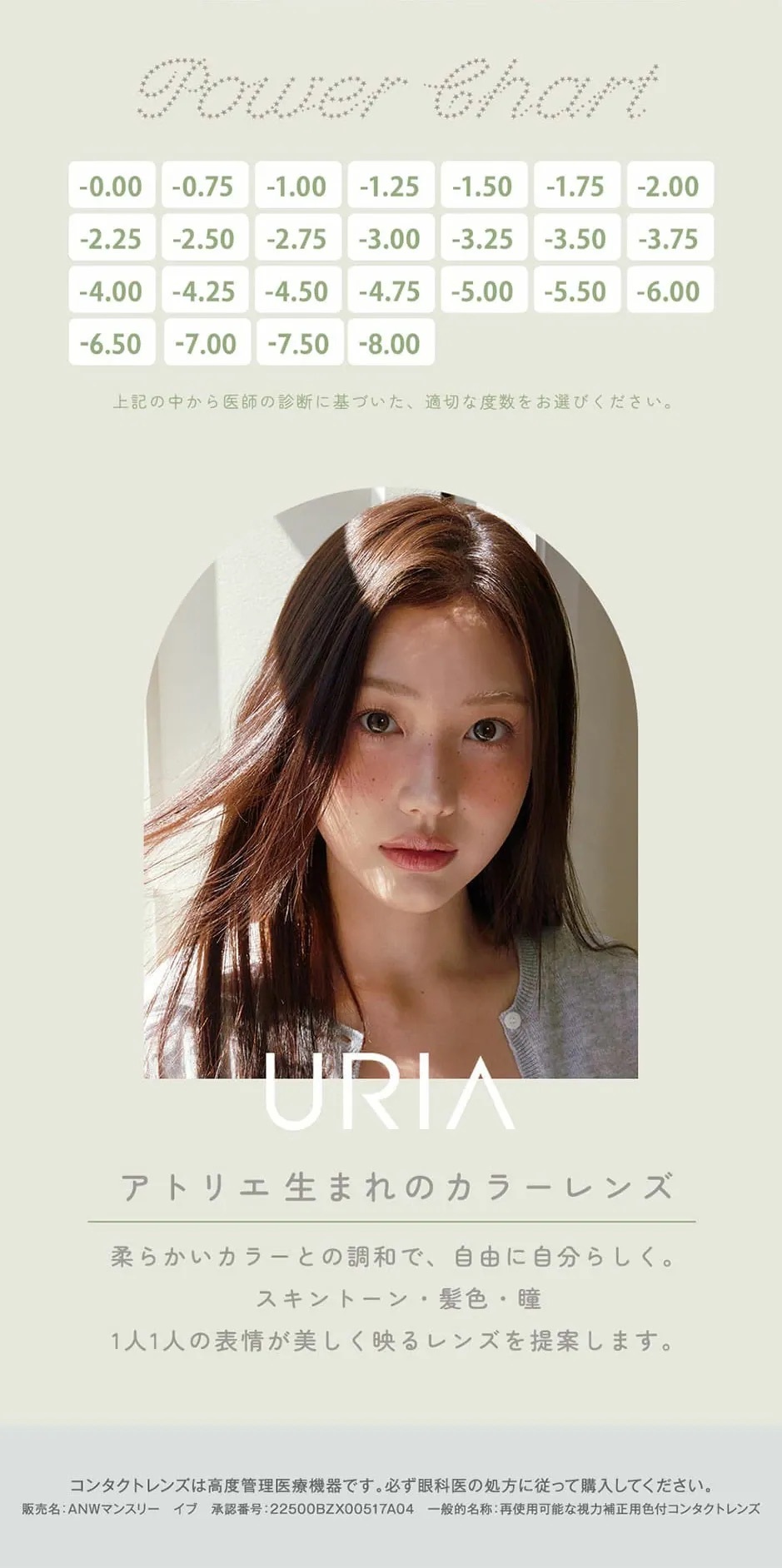 | 近視度數 | 0.00, -0.75, -1.00, -1.25, -1.50, -1.75, -2.00, -2.25, -2.50, -2.75, -3.00, -3.25, -3.50, -3.75, -4.00, -4.25, -4.50, -4.75, -5.00, -5.50, -6.00, -6.50, -7.00, -7.50, -8.00 |