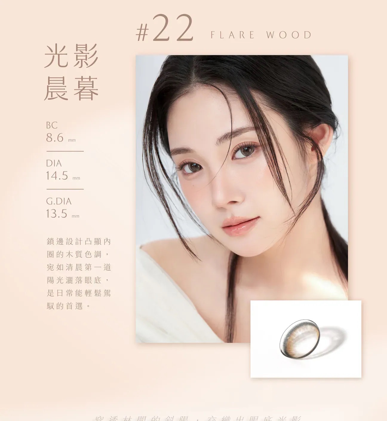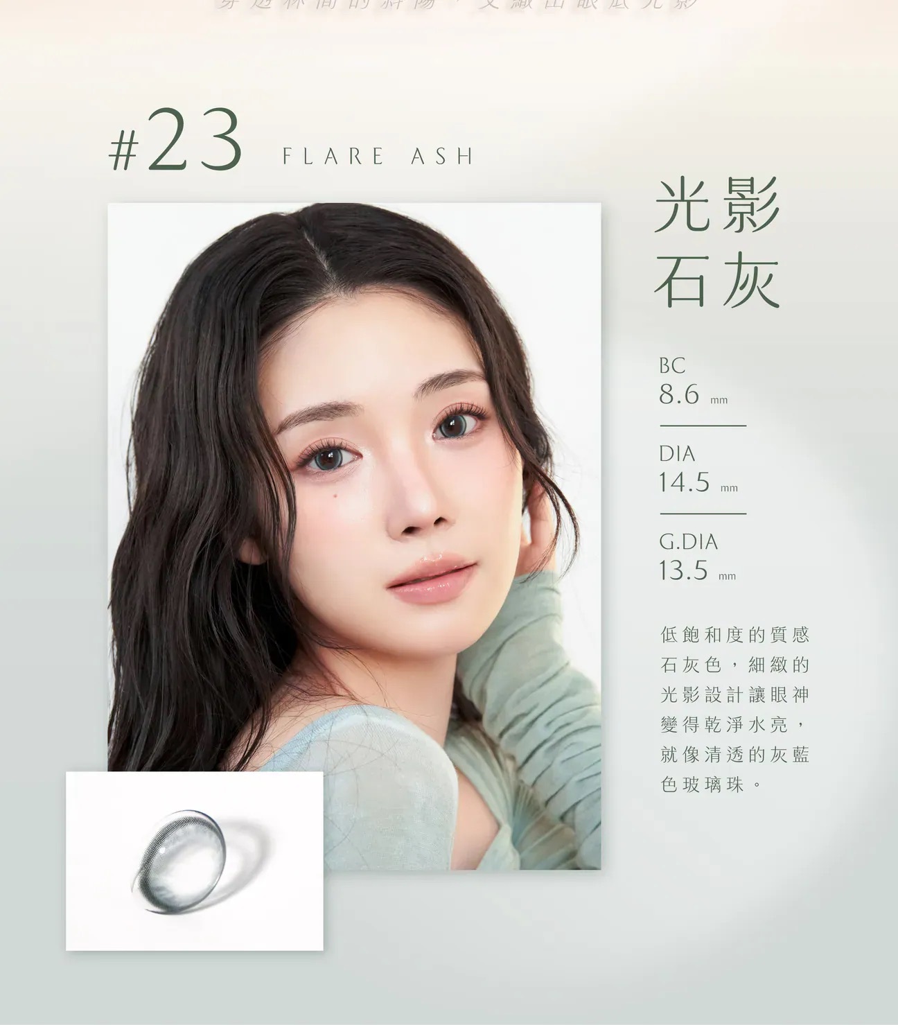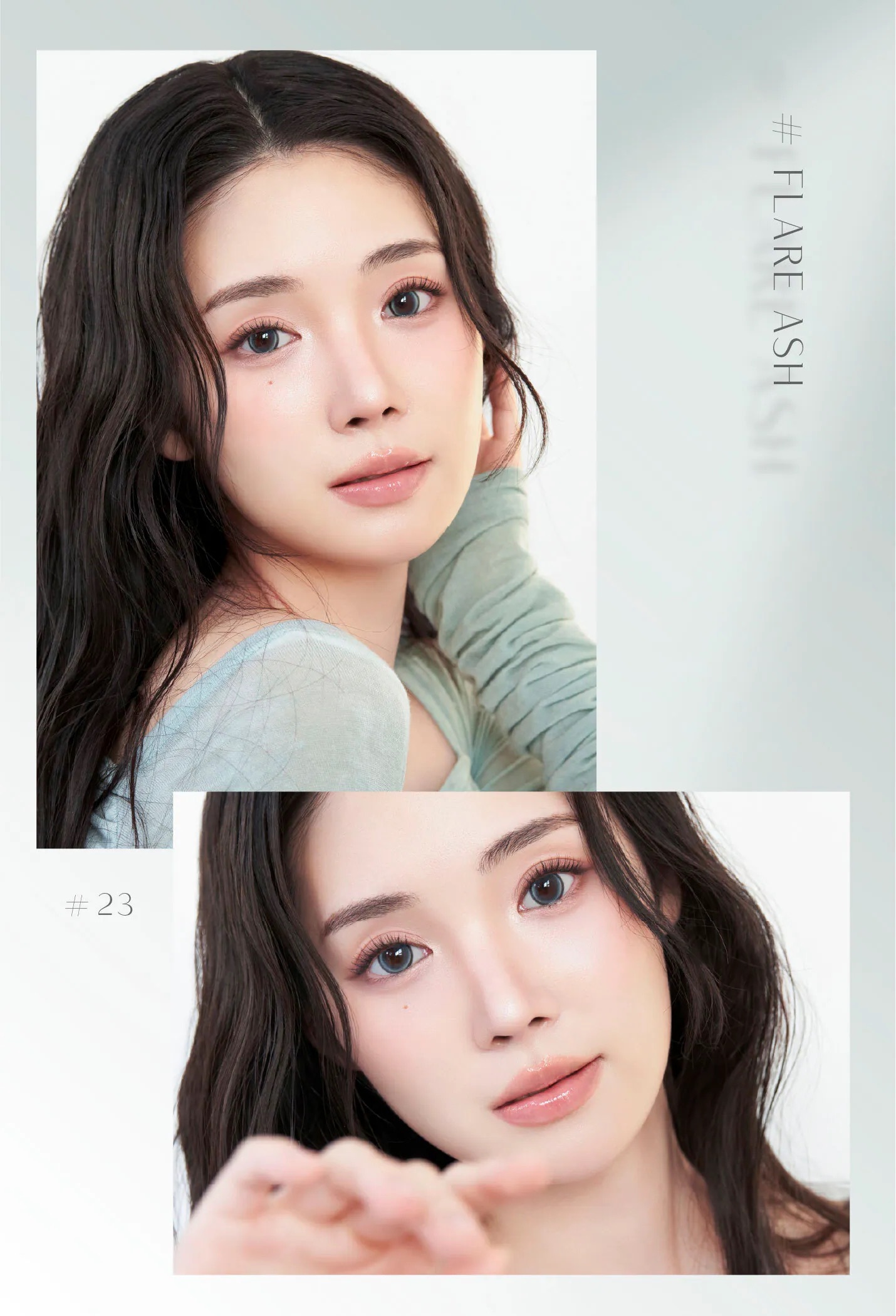 #23 Flare Ash 光影石灰。搭載「Fixed 180」定位技術,定格絕美瞬間。帶有透明感的冷調灰綠色,呈現如光影投射在石面上的澄澈感,打造高級清冷的混血眼。