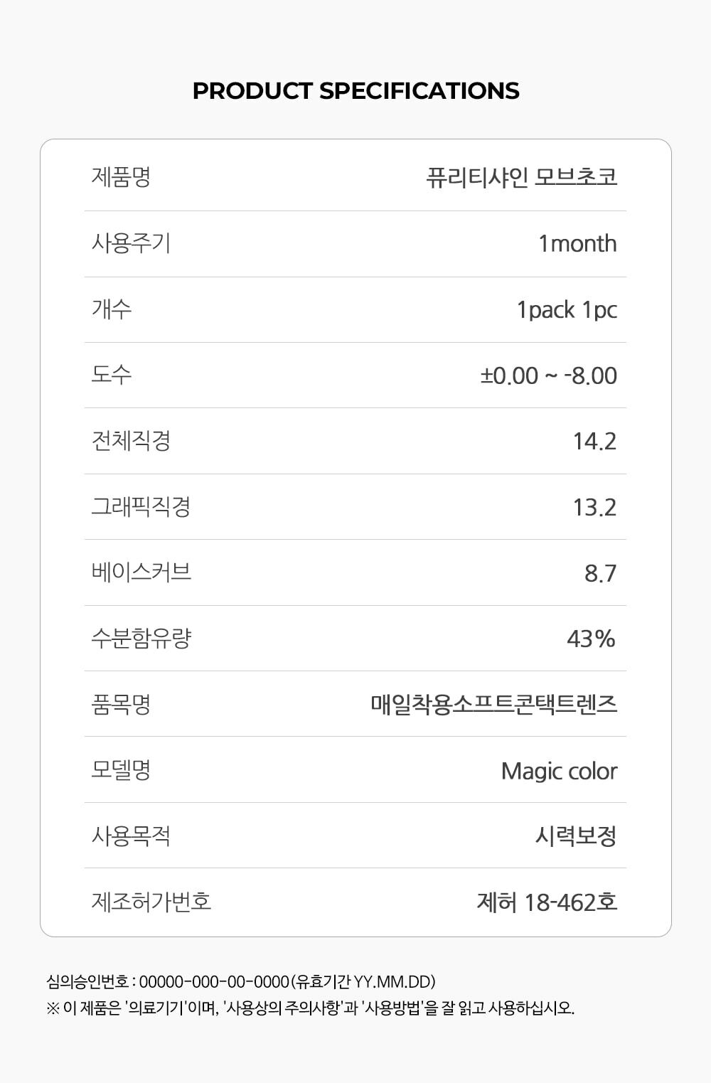 | 近視度數 | 0.00, -1.00, -1.25, -1.50, -1.75, ,-2.00, -2.25, -2.50, -2.75, -3.00, -3.25, -3.50, -3.75, -4.00, -4.25, -4.50, -4.75, -5.00, -5.50, -6.00, -6.50, -7.00, -7.50, -8.00 |