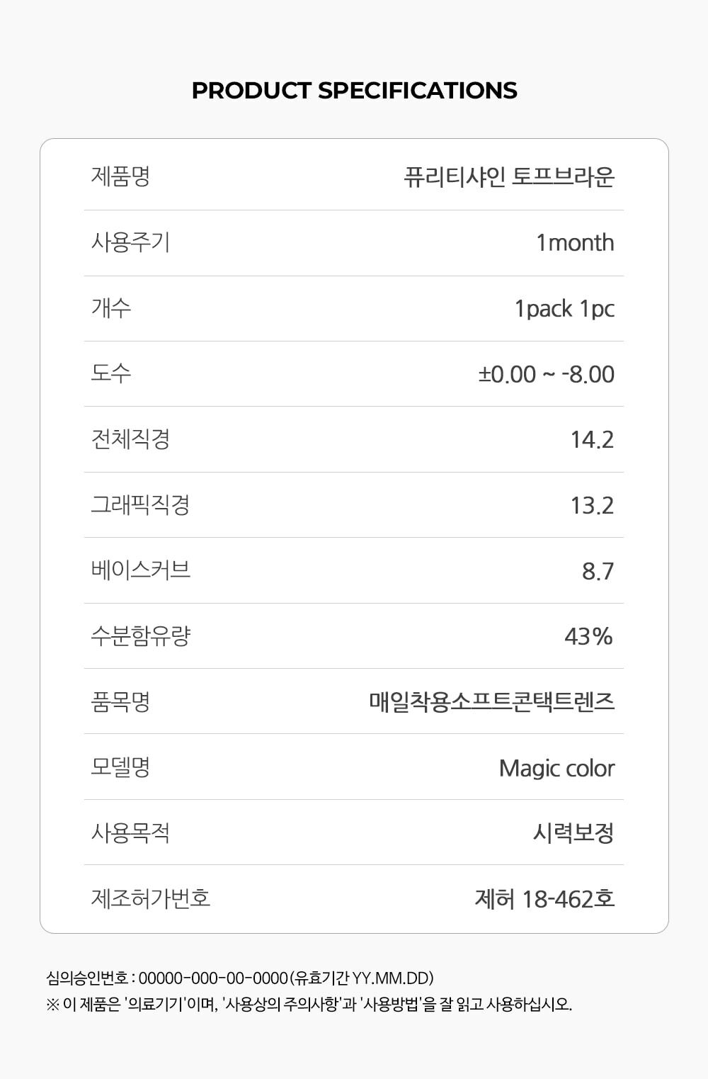 | 近視度數 | 0.00, -1.00, -1.25, -1.50, -1.75, ,-2.00, -2.25, -2.50, -2.75, -3.00, -3.25, -3.50, -3.75, -4.00, -4.25, -4.50, -4.75, -5.00, -5.50, -6.00, -6.50, -7.00, -7.50, -8.00 |