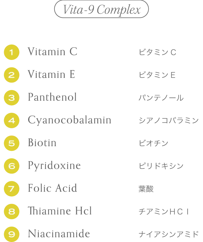 水、己二酸二丁酯、水楊酸丁基辛酯、辛酸/癸酸甘油三酯、乙基己基三嗪酮、泛醇、對苯二甲酸二樟腦磺酸、雙-乙基己氧基苯酚甲氧基苯基三嗪、菸鹼醯胺、氨丁三醇、氫化聚烯烴(C6-20)、1,2-己二醇、二乙氨基羥基苯甲醯苯甲酸己酯、戊二醇、聚矽氧烷-15、積雪草萃取、氫化卵磷脂、丙烯酸酯/C10-30烷基丙烯酸酯交聯聚合物、HDI/三羥甲基己基內酯交聯聚合物、腺苷、生育酚、甘油、硬脂酸聚甘油-10、抗壞血酸磷酸酯鈉、生育酚乙酸酯、生物素、鹽酸硫胺素、葉酸、吡哆醇氰鈷胺素、香料、乙基己基甘油