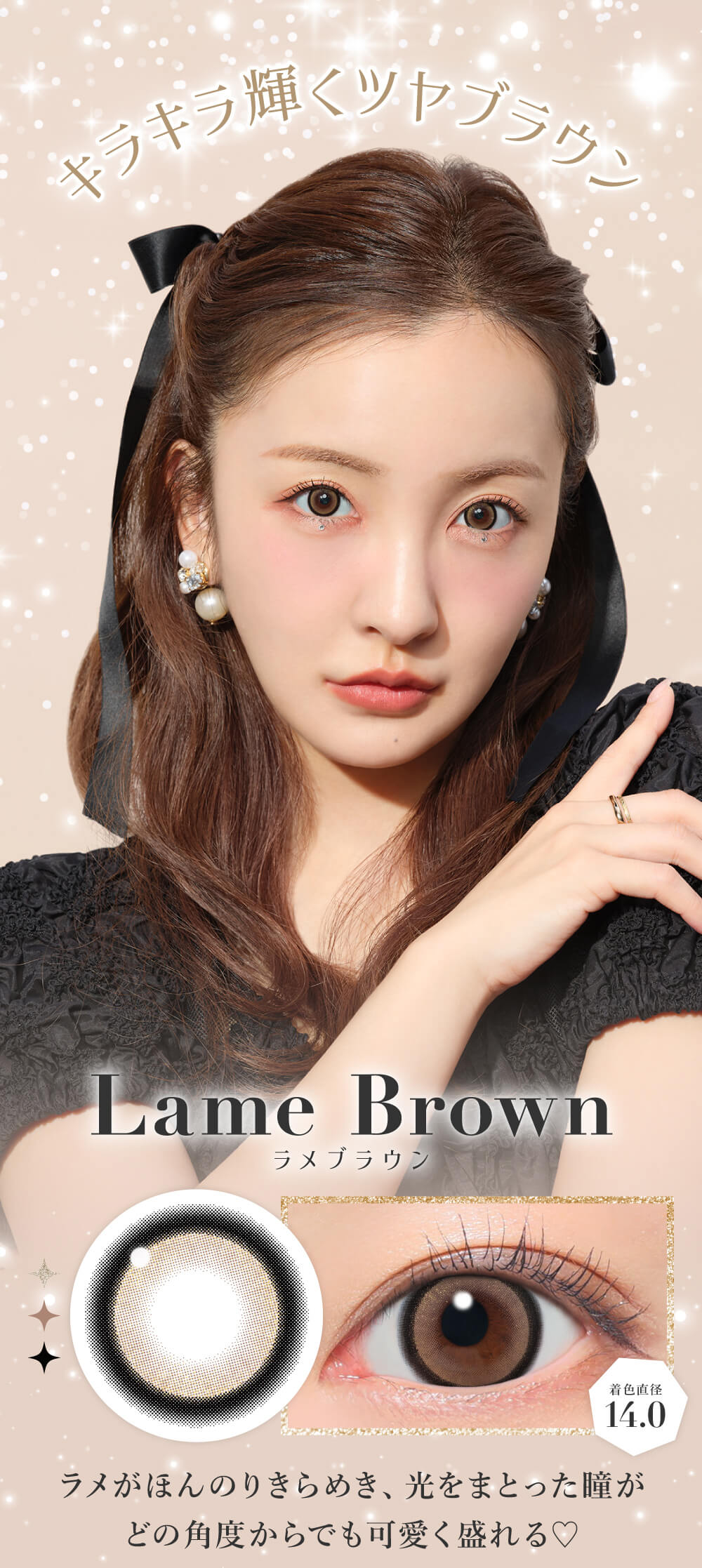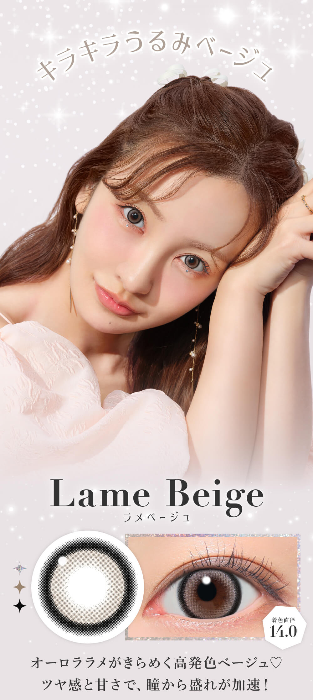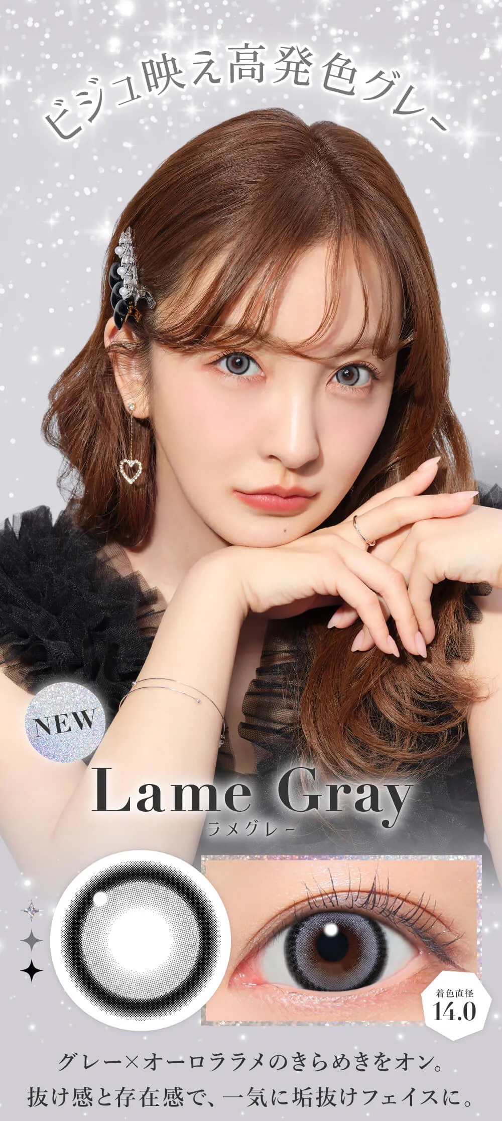 Secret Candy Magic 1 Day Lame Gray揉合了夢幻的極光銀河與高發色灰調,14.0mm 著色直徑在大膽放大之餘,更藏著極細閃粉。眨眼間散發如珠寶般閃爍的細膩光澤,完美平衡時髦與華麗感,讓妳的雙眸瞬間成為全場最亮的靈動焦點。