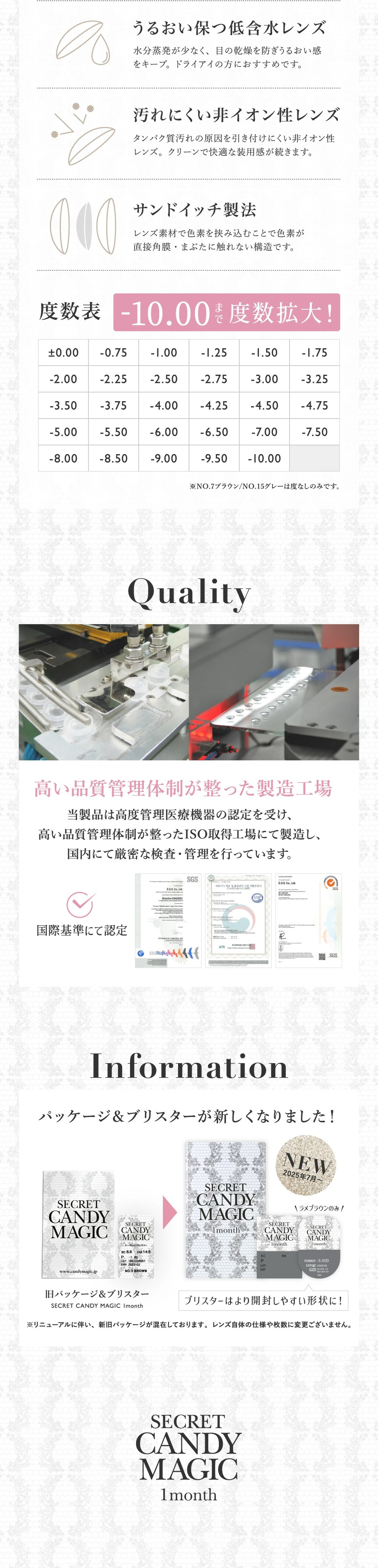 | 近視度數 | 0.00, -0.75, -1.00, -1.25, -1.50, -1.75, -2.00, -2.25, -2.50, -2.75, -3.00, -3.25, -3.50, -3.75, -4.00, -4.25, -4.50, -4.75, -5.00, -5.50, -6.00, -6.50, -7.00, -7.50, -8.00, -8.50, -9.00, -9.50, -10.0 |
