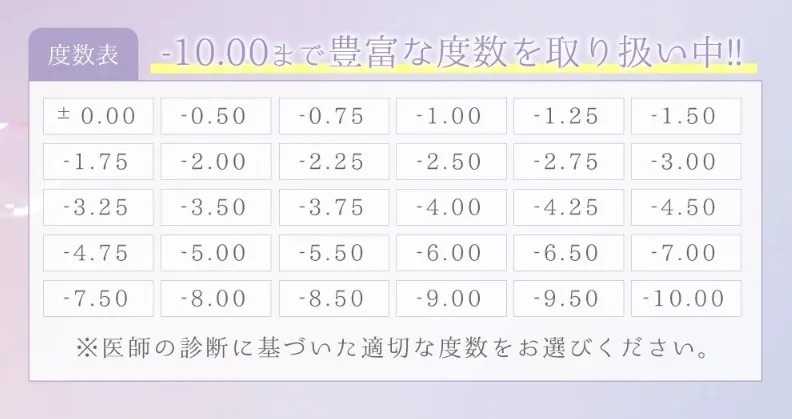 | 近視度數 | 0.00, -0.50, -0.75, -1.00, -1.25, -1.50, -1.75, -2.00, -2.25, -2.50, -2.75, -3.00, -3.25, -3.50, -3.75, -4.00, -4.25, -4.50, -4.75, -5.00, -5.50, -6.00, -6.50, -7.00, -7.50, -8.00, -8.50, -9.00, -9.50, -10.00 |